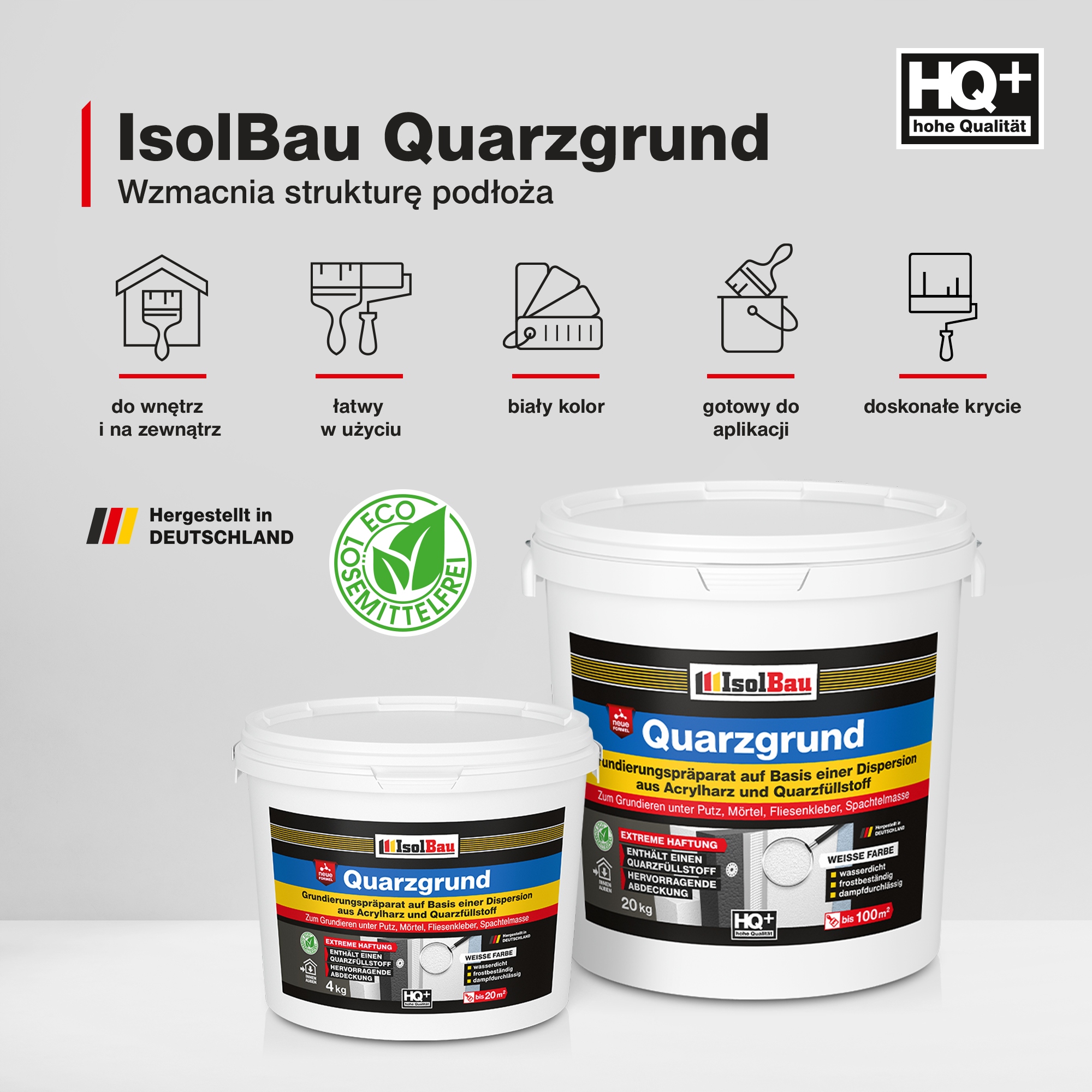 Земля для обработки Isolbau Quarzgrund должна быть сухой, нагрузкой, не свободной от остатков жира, клея, цементного молока и других примесей, которые могут ослабить адгезию продукта на землю. Старые слои краски, эпоксидная смола, смола и асфальт должны быть удалены. Фанерные панели должны быть свободны от парафиновых остатков, спутанных и очищенных мылом и водой. Новый и старый (отремонтированный) бетон должен быть связан и взрослый. Субстрат не может быть заморожен или покрыт морозом, не может быть водяных карманов. Isolbau Quarzgrund не предназначен для укрепления земли.