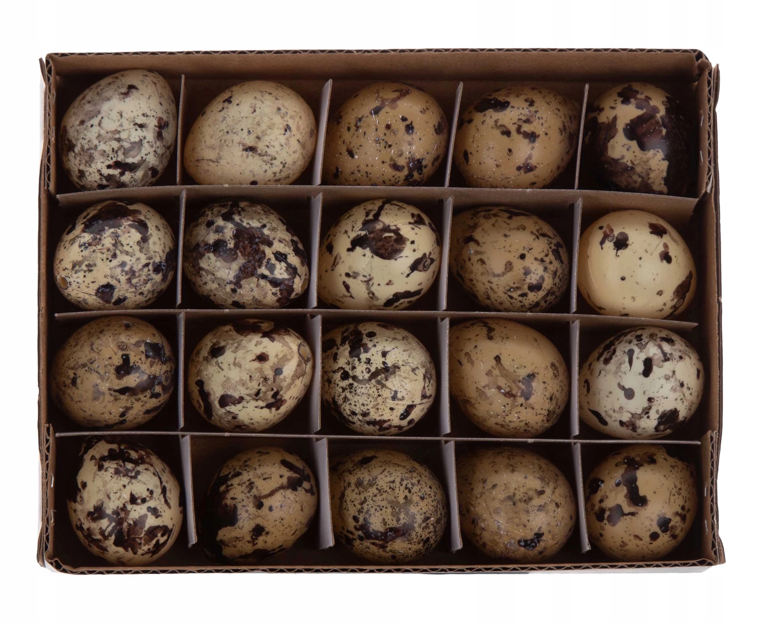 В предложении представлены пластиковые перепелиные яйца. Яйца имеют отверстия для подвешивания. Яйцо идеально подходит для весенних и пасхальных украшений. В упаковке 20 штук.