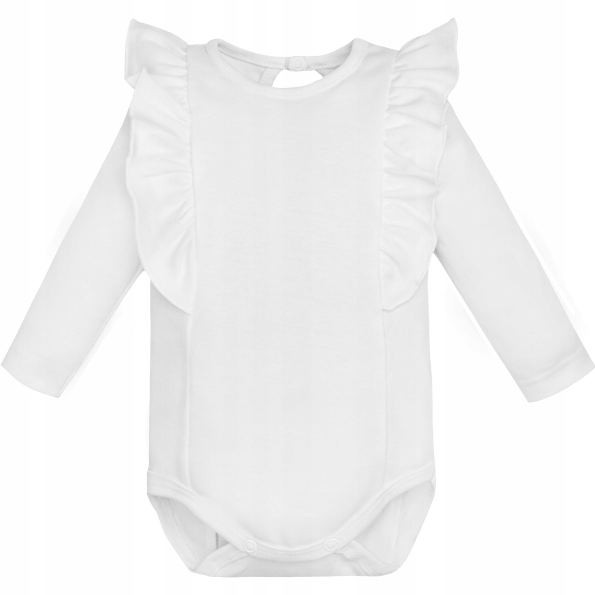 - очаровательное боди с длинными рукавами; он богато украшен рюшами, идущими от талии спереди через плечи и спину; боди имеет очаровательный вырез на шее с застежкой-кнопкой; боди белое.