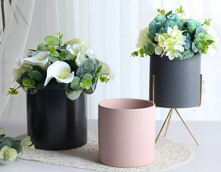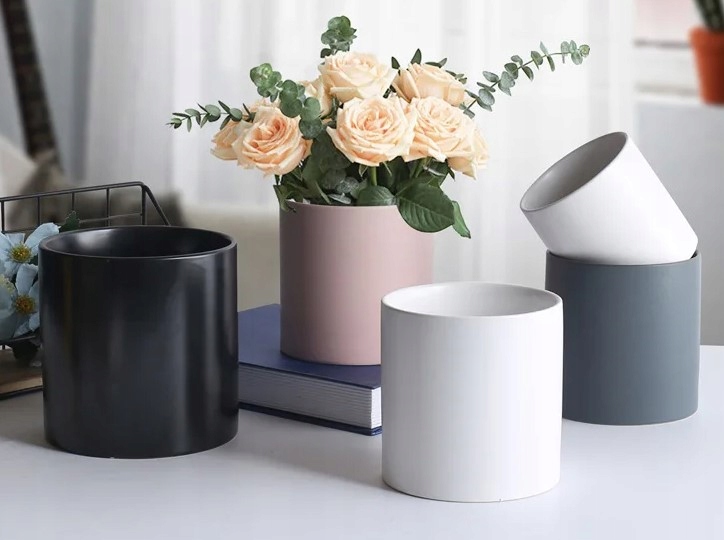 Цветочный горшок изготовлен из керамики. Крышка имеет цилиндрическую форму и отлично впишется в современный интерьер. В горшке прекрасно смотрятся как живые растения, так и искусственные цветы.