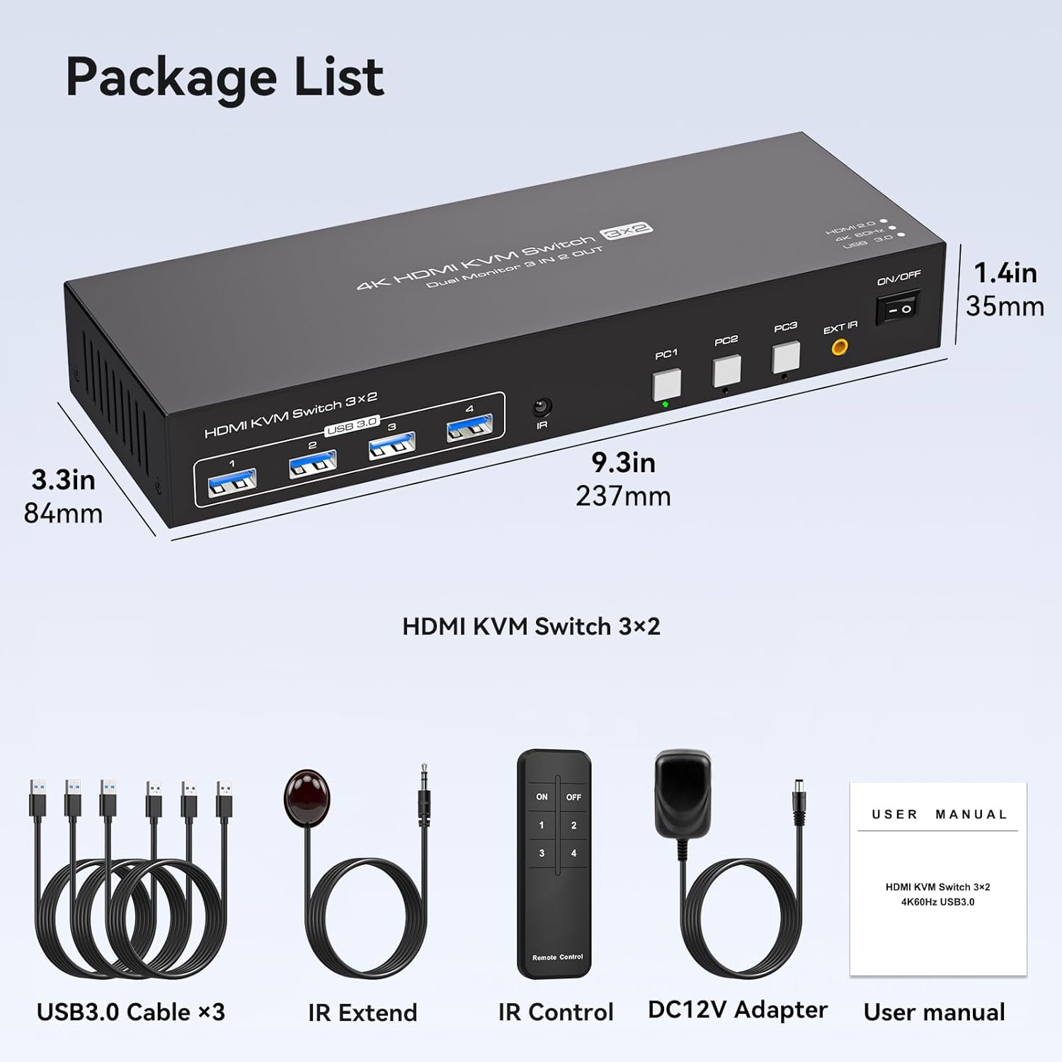- HDMI KVM USB 3.0 Переключатель для 3 компьютеров: переключатель KVM для 3 компьютеров и 2 монитора имеет 4 порта USB 3.0 с скоростью передачи данных до 5 ГБ/с, в 10 раз быстрее, чем порты USB 2.0 и является ретроградным совместимым с устройствами USB 2.0/1.1. Он распознает клавиатуры, мышей, принтеры и другие USB -устройства. Внешний источник питания 12 В/1 А позволяет стабильный источник питания высокооборотных USB -устройств.