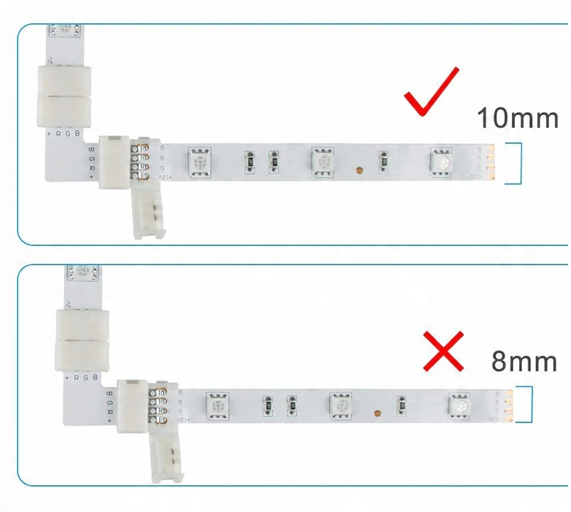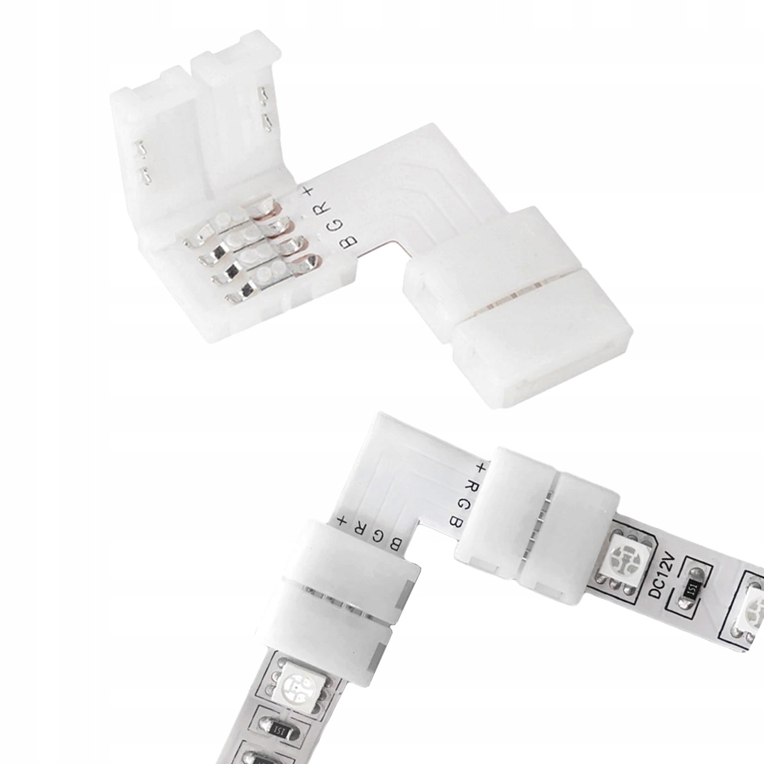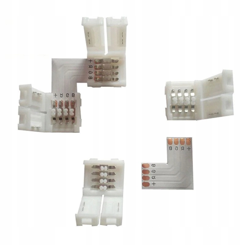 Угловой разъем с ручным обжатием для светодиодных лент RGB с 4 точками пайки. Он позволяет быстро соединить две светодиодные ленты SMD 5050 шириной 10 мм по углам без необходимости использования паяльника. Просто поместите ленту правильно и закройте защелку. Разъемы можно легко снять. Они многоразовые. Разъем можно зажать на обычную или водонепроницаемую RGB-ленту (предварительно сняв силиконовую крышку).