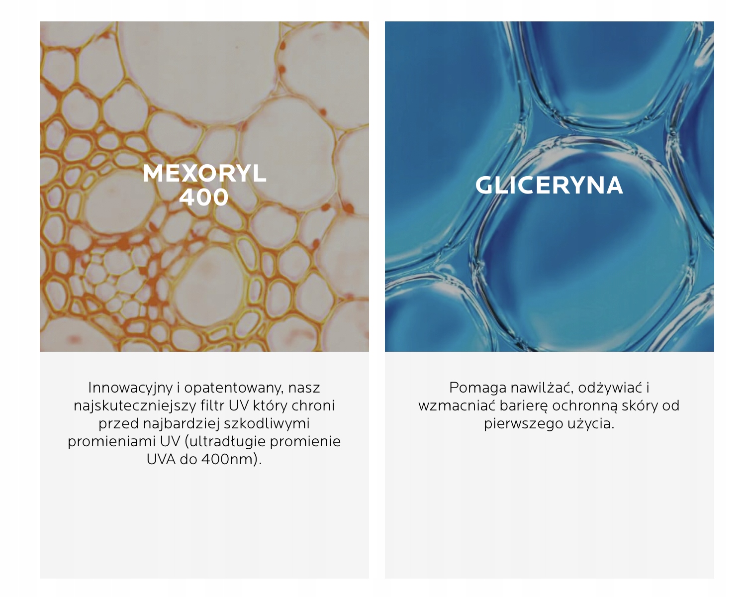 Наша самая эффективная защита — запатентованный УФ-фильтр MEXORYL 400, который защищает от самых вредных лучей UVA (длиной волны до 400 нм) и от глубокого повреждения клеток. Обеспечивает широкий спектр действия против лучей UVA и UVB.