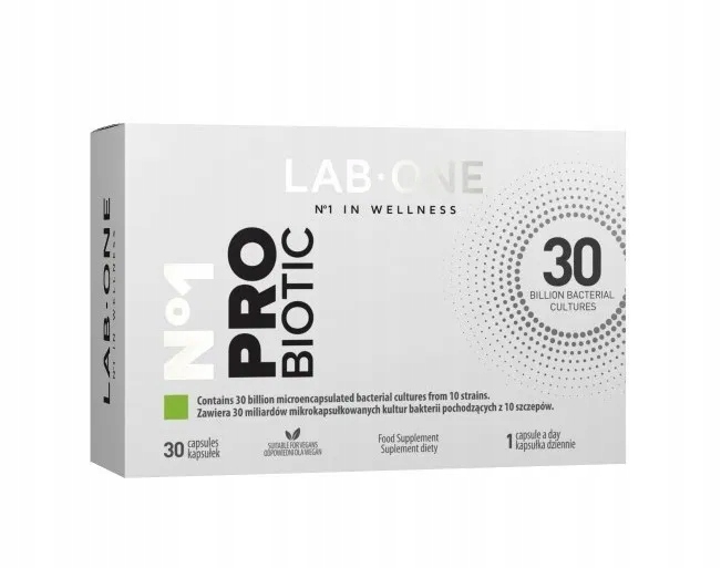 n ° 1 Пробиотик составляет 30 миллиардов бактериальных культур в каждой капсуле добавок. Бактерии происходят от 10 штаммов, и, кроме того, композиция включала в себя акацию. Запатентованная технология микрокапсул способствует увеличению выживания бактериальных клеток.