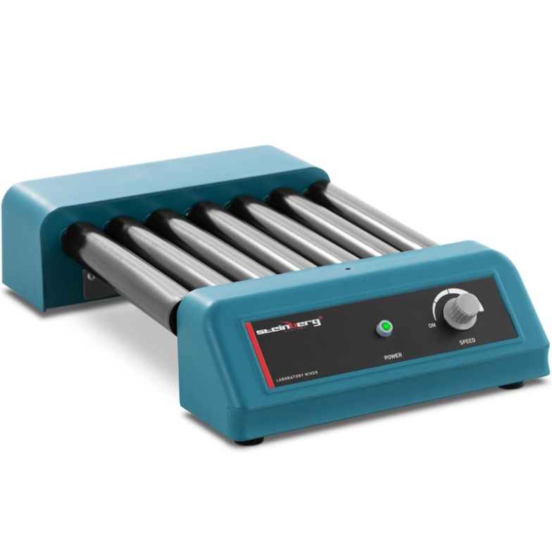 Шейкер имеет мощность 12 Вт. Выполняет равномерные перекатывания и повороты. Скорость в диапазоне 0 - 100 об/мин регулируется ручкой. 7 роликов миксера вмещают 6 флаконов. Ролики изготовлены из прочного АБС-пластика, идеально подходят для постоянной работы в лаборатории.