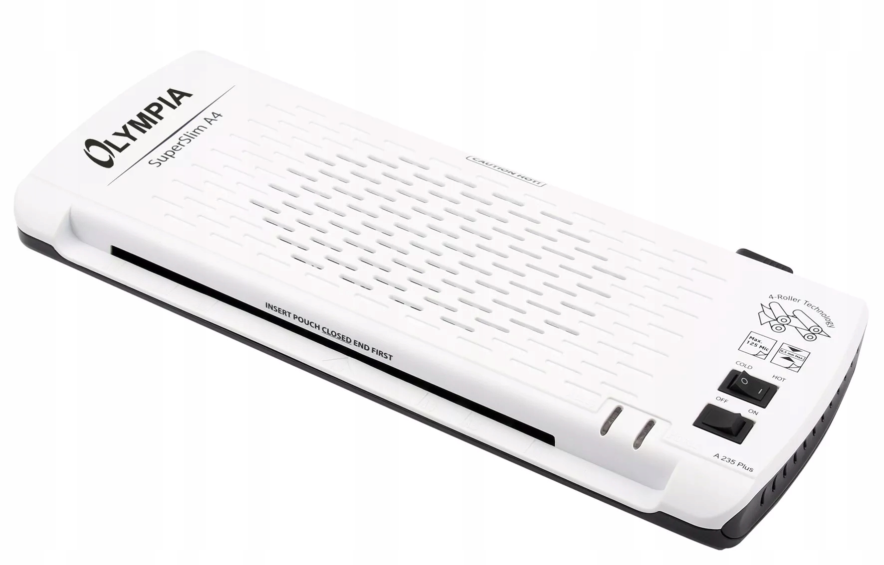 Olympia A 235 Plus — ламинированная машина с 4 цилиндрами и современным ультратонким дизайном. Нагревается за 3–4 минуты. Вы можете ламинировать документы формата A4 или меньше (ширина загрузки 230 мм) фольгой толщиной от 80 до 125 микрон. Ламинирование одного листа формата А4 занимает около 1 минуты.