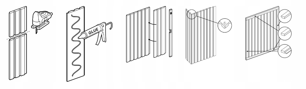 панели Linerio имеют чрезвычайно простую и интуитивно понятную сборку. Это может быть сделано вертикально, ровно и по диагонали. Просто порежьте панели пилой или мозолем к требуемому измерению, затем нанесите клей (на форме буквы «S») к задней части панели и прикрепите его к стене.