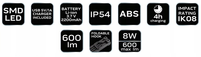 Светильник аккумуляторный мастерской NEO (арт. 99-043) оснащен светодиодами SMD мощностью 8 Вт и световым потоком 600 люмен.