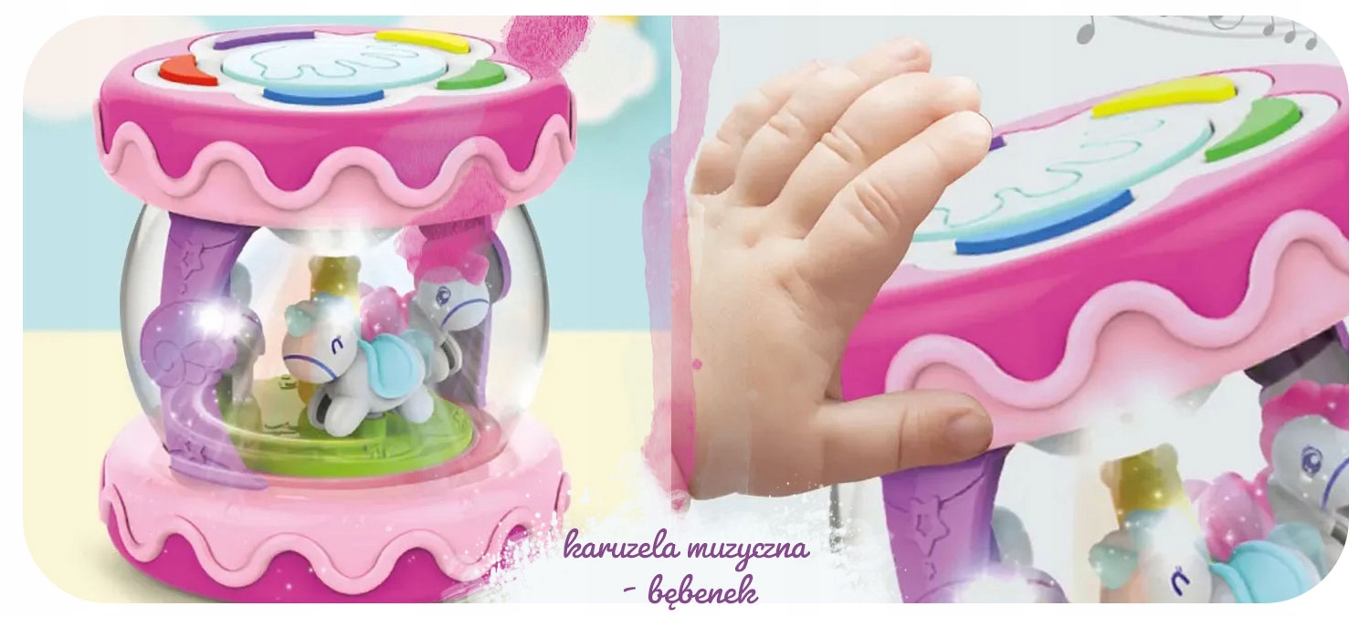 Игрушка работает как музыкальная шкатулка с вращающимися лошадьми внутри. Он имеет 6 звуковых кнопок, включая большой барабан. Во время воспроизведения мелодий индикаторы мигают. Ночью игрушка работает как проектор — лампочки светятся и имитируют звезды. Игрушка имеет режим ожидания через 60 секунд без использования звуков. Игрушка хорошо развивает чувства ребенка и надолго удерживает внимание ребенка.