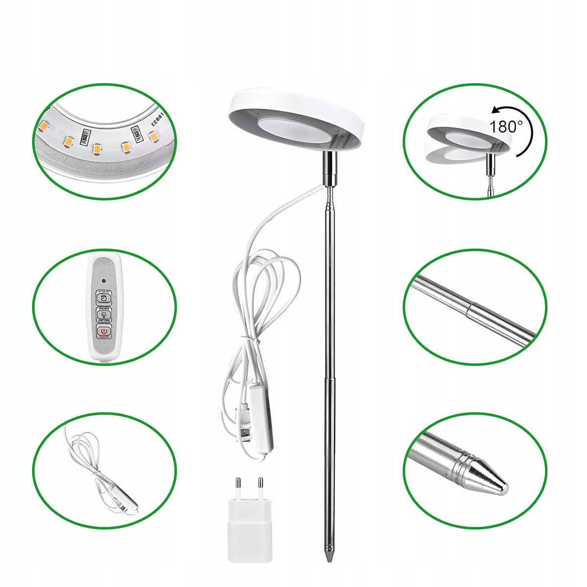 ✅Выдвижная опорная планка: выдвижная опорная планка изготовлена из нержавеющей стали для предотвращения ржавчины. Просто вставьте регулируемый стержень в горшок с растением и установите желаемую высоту (диапазон регулировки: 20 ~ 64 см), стараясь не сложить световое кольцо назад. Ракурс указан на фото.