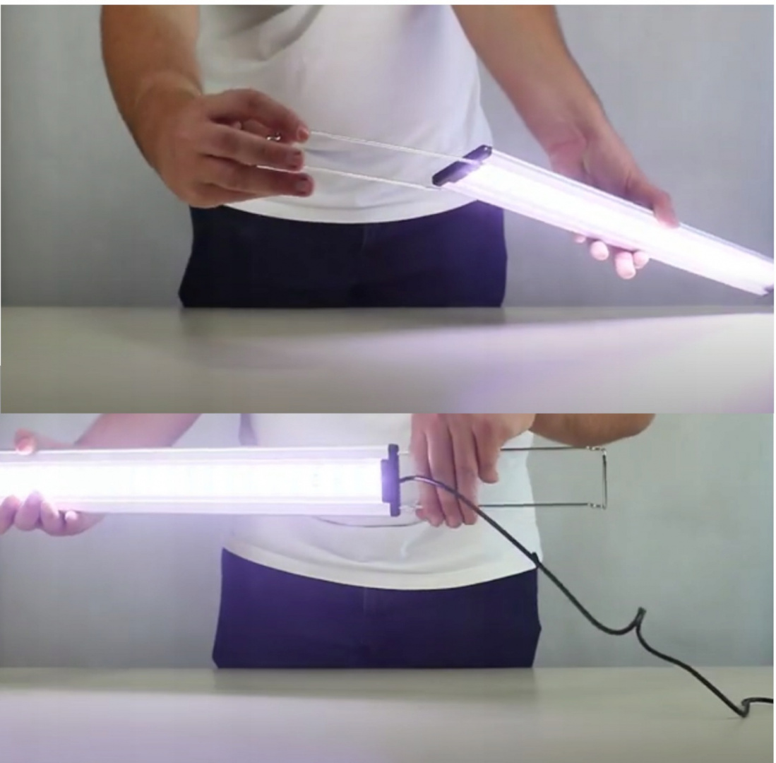 После извлечения из упаковки установите проволочные держатели с обеих сторон лампы, а затем разверните их так, чтобы они упирались в стекло аквариума.