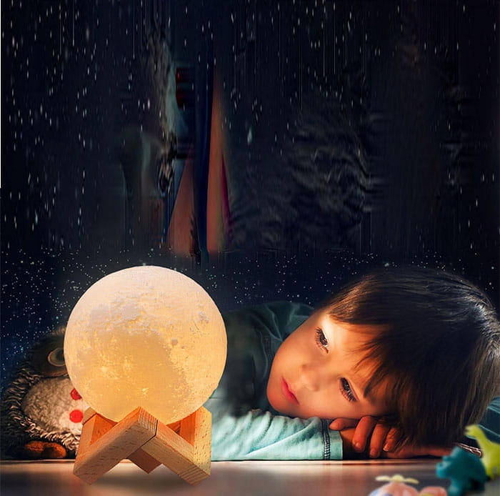 Ночник Glowing Moon – небольшое устройство, которое идеально подойдет для спальни, детской комнаты, офиса и многих других мест. Его также можно использовать в качестве украшения, создавая уютную атмосферу. Меняет цвет свечения на ощупь. Высота с подставкой около 17 см.