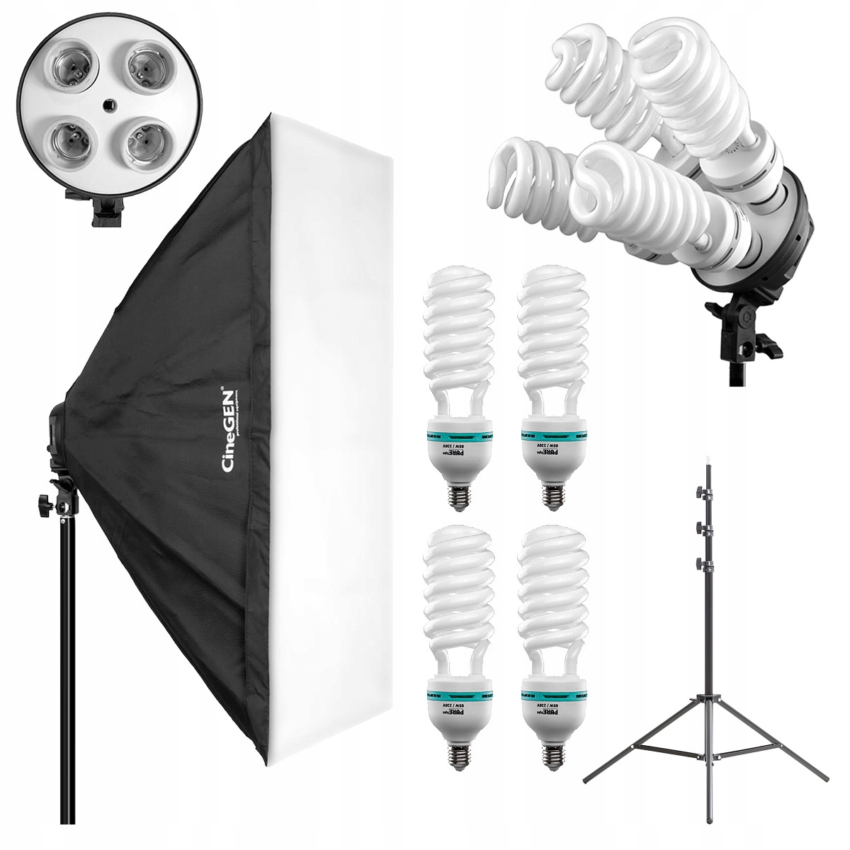 Светильник будет доставлен Вам в упаковке, содержащей: отдельно: штатив, лампочки, светильник и софтбокс. Сборка светильника состоит из нескольких этапов: