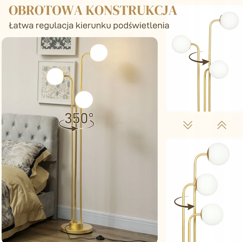 оснащен тремя регулируемыми оттенками, которые вращаются 350 °, предлагают гибкие варианты освещения, идеально подходящие для любой комнаты. Его современный дизайн с золотой основой и матовым белым абажуром добавляет уникальный характер любому интерьеру. Стабильная, круглая база обеспечивает безопасность, и лампа становится эффективным акцентом, независимо от того, стоит ли она рядом с диваном или в углу комнаты. Введите стиль и функциональность в свой дом!