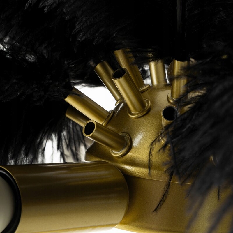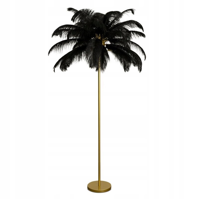 Feri Stand Lamp очарует клиентов, которые ищут чрезвычайно эффективные аксессуары для отделки внутренних дел. Он обязан своим уникальным характером необычному дизайну. Стронная металлическая основание в золотом цвете была покрыта абажуром с перьями с натуральными страусами. световые эффекты Когда лампа включена. Ретро стиль, ар -деко.
