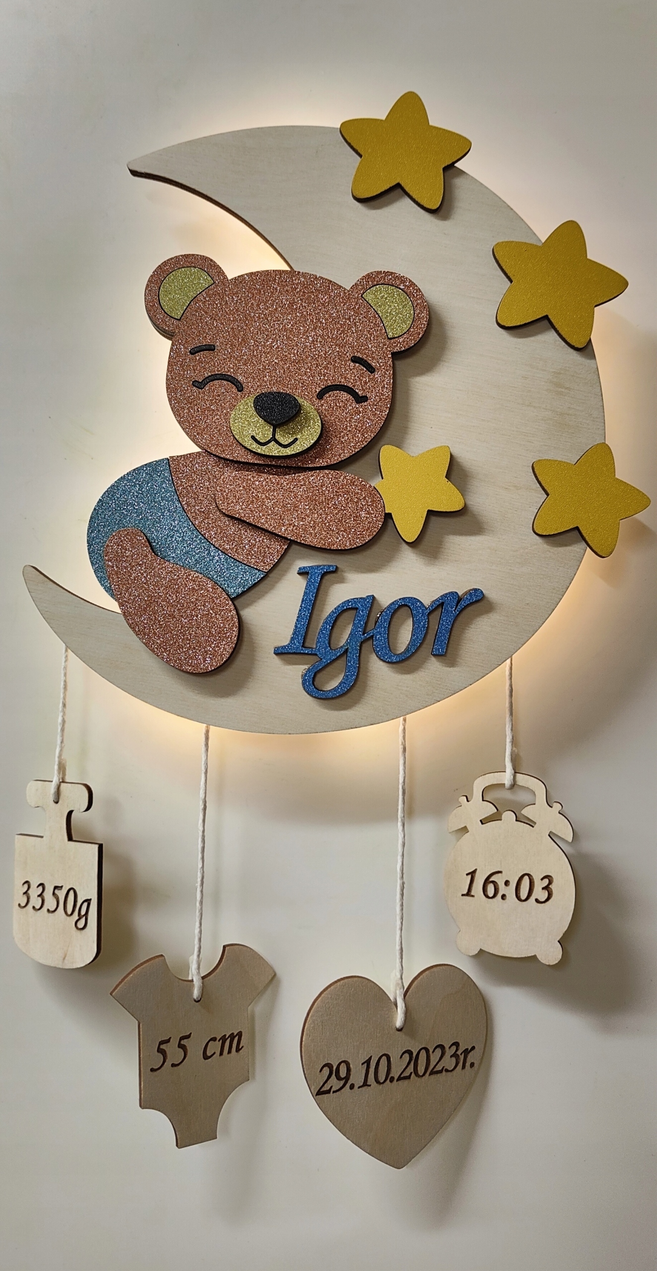 Lampka nocna misio śpiący na księżycu imienna metryczka brokatowa sklejka