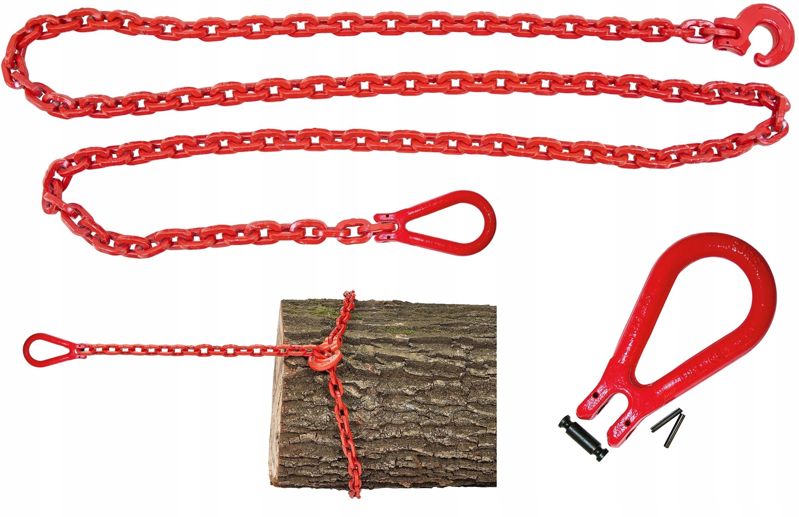 Применение:Цепь адаптирована для трелевки в лесном хозяйстве и других лесохозяйственных и сельскохозяйственных работ. Цепочка заканчивается звеном с одной стороны и скользящим крючком с другой стороны. Адаптированная форма крючка обеспечивает надежное зацепление за цепь без возможности самоотсоединения и легкое скольжение по квадратной цепи при зажиме на бревне.