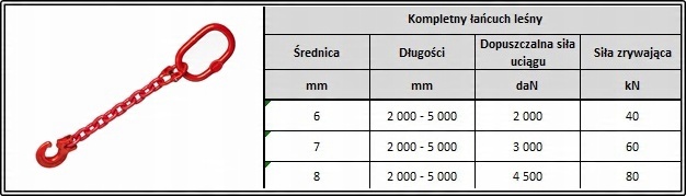 ИСПИСАНИЕ: Одноветвевая трелевочная цепь из высококачественной стали согласно PN-EN 818-4, с сертифицированными компонентами и долговечной трелевочной цепью с прочностью на разрыв 800 Н/мм2 / G80 / отвечающей требованиям Директивы по машинному оборудованию 2006/42/EC изд. Май 2006. Цепь круглая, соответствующая стандарту EN 818-2.