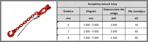ИСПОЛНЕНИЕ: Одноветвевая трелевочная цепь из высококачественной стали согласно PN-EN 818-4, с сертифицированными компонентами и трелевочной цепью с предел прочности 800 Н/мм2 / G80 / соответствует требованиям Директивы по машинному оборудованию 2006/42/EC изд. Май 2006 г. Цепь круглая, соответствующая стандарту EN 818-2