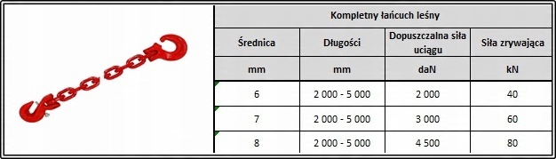 ИСПОЛНЕНИЕ: Одноветвевая трелевочная цепь из высококачественной стали согласно PN-EN 818-4, с сертифицированными компонентами и трелевочной цепью с прочностью на растяжение. 800 Н/мм2 / G80 / соответствует требованиям Директивы по машинному оборудованию 2006/42/EC изд. Май 2006 г. Цепь круглая, соответствующая стандарту EN 818-2