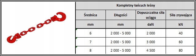 ИСПОЛНЕНИЕ: 1-ветвевая трелевочная цепь из высококачественной стали согласно PN-EN 818-4, изготовлен из сертифицированных компонентов и трелевочной цепи с пределом прочности 800 Н/мм2 / G80 / в соответствии с требованиями Директивы по машинному оборудованию 2006/42/EC изд. Май 2006. Цепь круглая, соответствующая стандарту EN 818-2