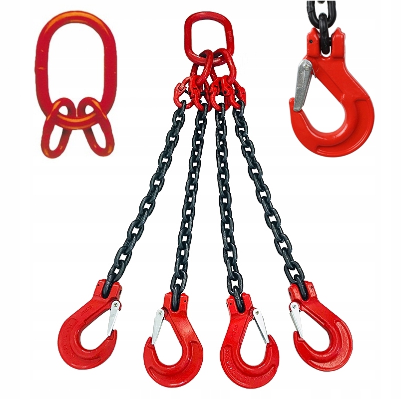 4-ветвевой цепной строп с коллективным звеном /размеры звенья 160 х 90 мм и 70 х 34 мм - малые/и вилочные крючки с защитой от отсоединения троса трещоткой.