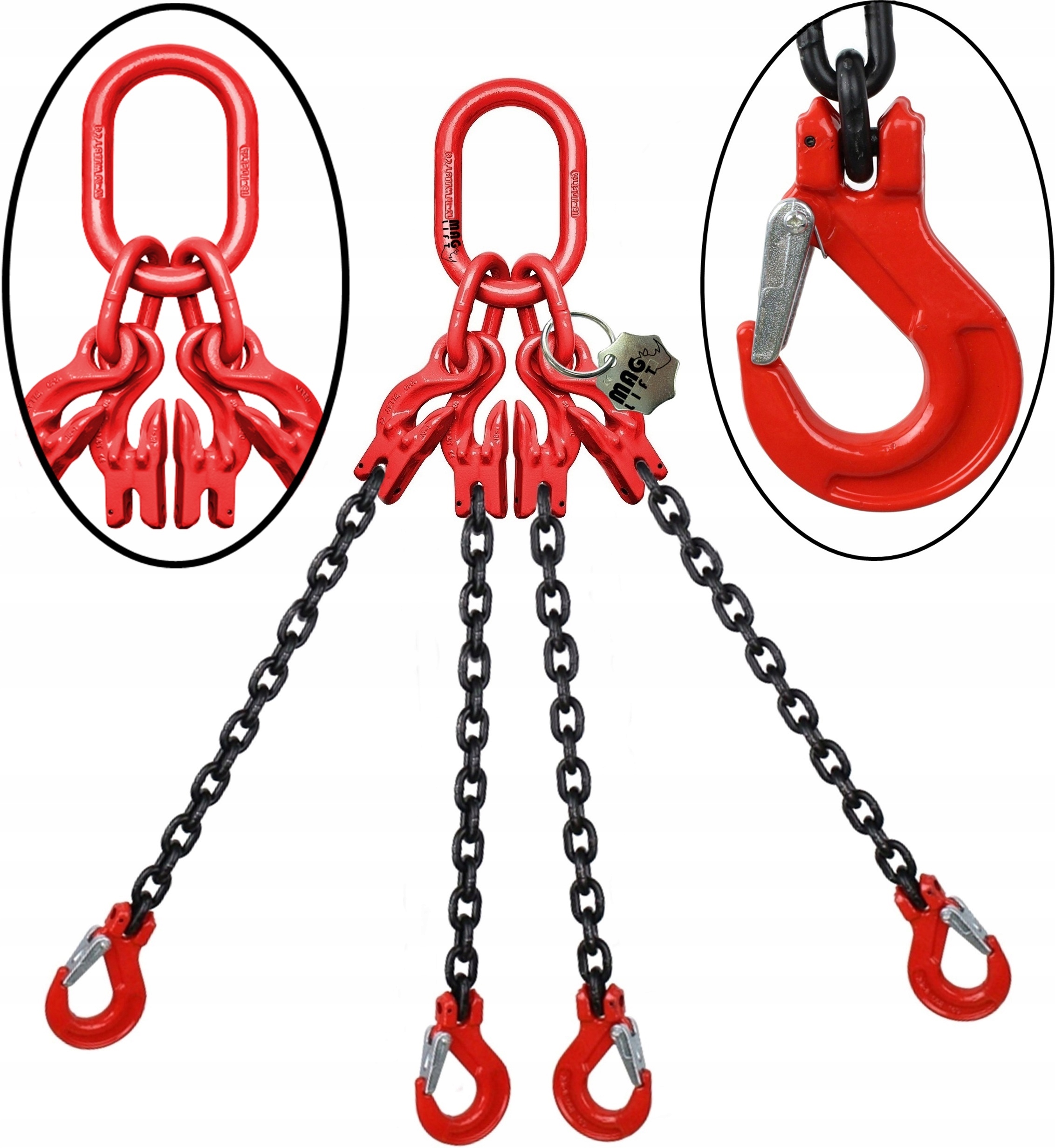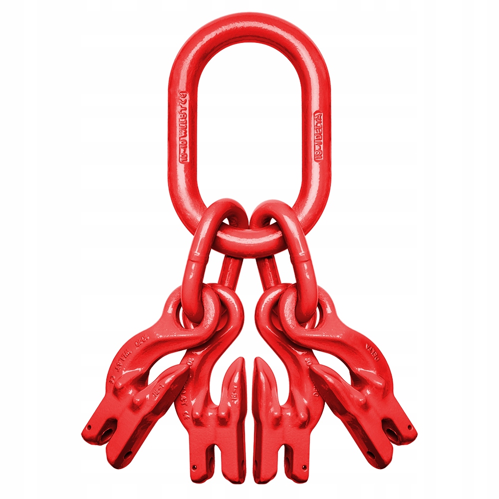 ИСПОЛНЕНИЕ: 4-ветвевой цепной строп, изготовленный в соответствии с PN-EN 818-4 из сертифицированных компонентов и строповой цепи с прочностью на разрыв 800 Н/мм2 / GR8 / и отвечающий требованиям Директивы по машинному оборудованию 2006/42/EC, редакция май 2006 г.
