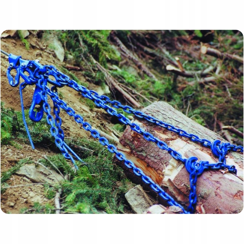 В комплект входят квадратная цепь, пропускной крючок и шплинт, готовые к немедленному использованию. Квадратное сечение звеньев предотвращает соскальзывание цепи с дерева, а крючок обеспечивает надежное и устойчивое крепление. Шплинт позволяет легко и быстро продеть цепь под бревно.