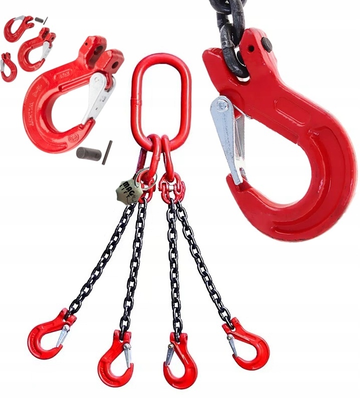 4-ветвевой цепной строп с коллективным звеном /размеры звенья 160 x 90 мм / с вилочными крючками с защитой.