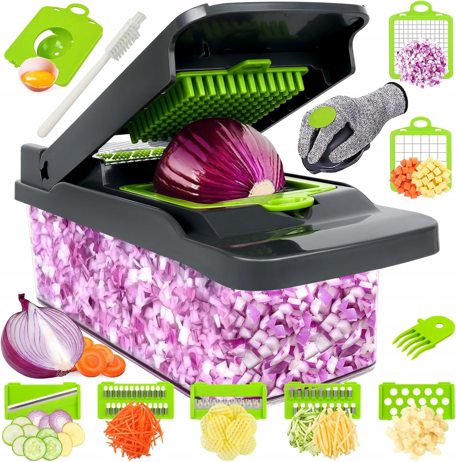 Овощный слайлер 16 в 1 - овощной челнок содержит 7 лезвий: 2 x кубиков для резки, 2 x овощного трансфера, 2 x шредер и кухонный помощник: 1 x яичный сепаратор, 1 х нож для очистки, 1 x разрядная корзина, 1 x ручная крышка, 1 x чистящая щетка и вилка, 1 x 1 x 1 x 1 x 1 x 1 x 1 x продовольственное содержание и 1 x 1c. * * Овощи Spatpatel. Вы можете использовать множество вариантов резки и быстро приготовить посуду, которые будут соответствовать всем вашим требованиям для разрезания на кубики, резки и трения.