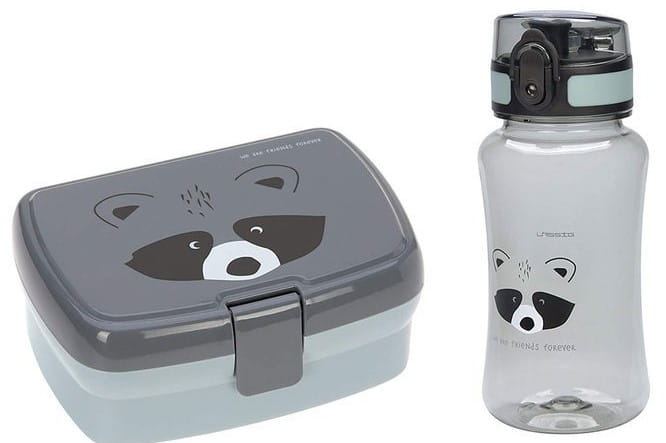 Ланч-бокс светло-бирюзового цвета имеет серая крышка с изображением милого енота. Такое же лицо изображено и на бутылке.