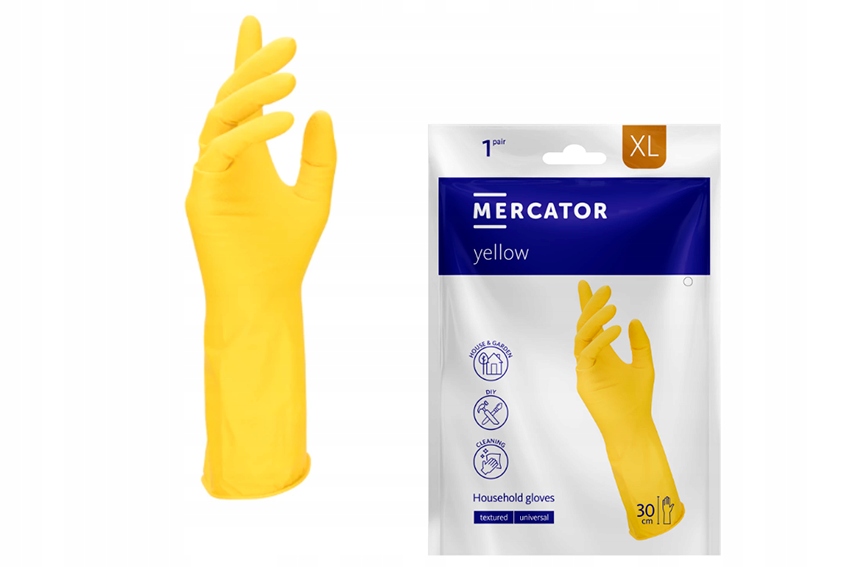 - Экономические перчатки Mercator Yellow имеют специально текстурированную броскую поверхность, способствуя эффективности работы во влажной среде, одновременно улучшая сцепление и контроль движений. Экономические перчатки изготовлены из желтого натурального каучука латекса . Они мягкие и гибкие, что влияет на комфорт работы и точность движений. Более длинные манжеты перчатки - 300 мм - она также защищает префакты.