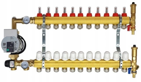 Каждый распределитель теплого пола, независимо от количества контуров, имеет одинаковый принцип работы. Благодаря ряду выходов для воды (или другого теплоносителя) он может разветвлять поток на нужное количество контуров, в данном случае. 11. Контуры. Каждый контур создает отдельную секцию отопления, которая может отвечать за обогрев отдельного помещения - или более низкую температуру в ванной, если это помещение большего размера. Благодаря тому, что отопление разделено на контуры - мы можем назначать отдельные параметры каждому из них, мы получаем управляемость - мы можем использовать его, например, для установки разных температур в разных комнатах, например, для установки разных температур от крана. Электрические приводы переменного тока 230 В автоматически открывают соответствующую секцию, когда мы хотим достичь более высокой температуры, например, в гостиной, а также закрывают ее при достижении ожидаемой температуры. Мы можем удобно установить ожидаемую температуру на комнатном контроллере, который будет синхронизирован с исполнительными механизмами практически в каждой комнате, практически не требуя обслуживания (кроме нажатия нескольких кнопок на контроллере).