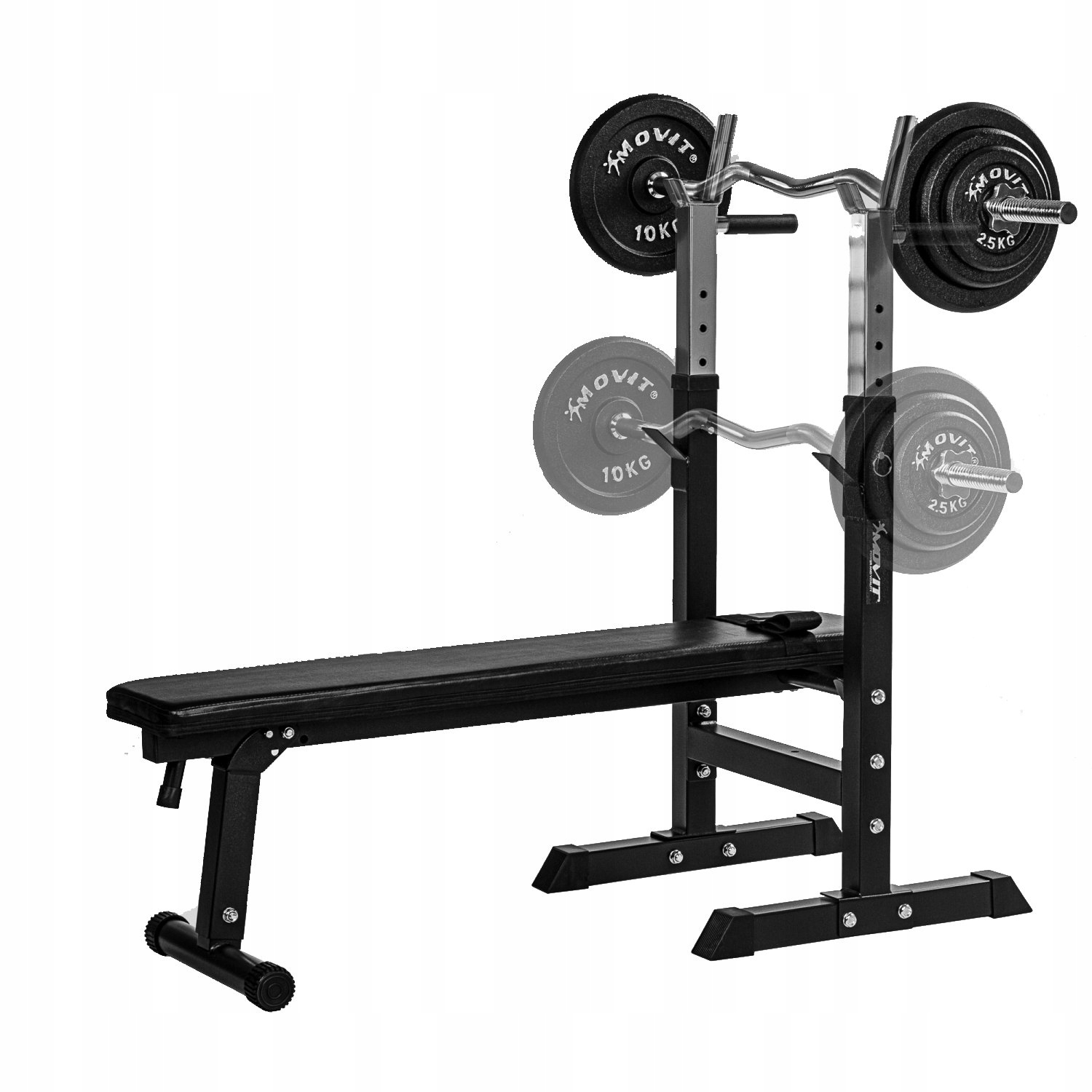 Скамья для тренировок 3 в 1 (скамья + стойка для штанги + держатели для отжиманий) от немецкого бренда MOVIT®. Имеет пятиступенчатую регулировку подставок по высоте и двухступенчатую регулировку угла наклона сиденья. Благодаря складным ножкам тренировочную скамью можно также использовать в качестве наклонной скамьи для скручиваний, а также ремню для ног, который предотвращает сгибание ног во время упражнений, повышая их эффективность. Толстое удобное сиденье сделает тренировку более комфортной. После тренировки вы можете сложить его и сэкономить место в домашнем спортзале. Скамья улучшит ваше общее физическое состояние и поможет достичь цели независимо от вашего уровня подготовки.