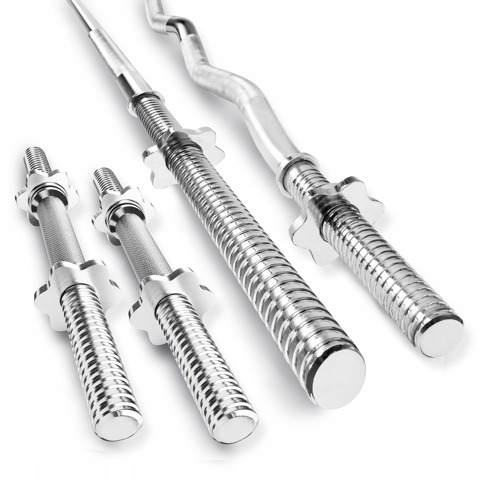 - две короткие прямые штанги для гантелей - с широким спектром применения, в том числе: для упражнений на бицепс, трицепс, предплечья, плечи, спину и грудь.