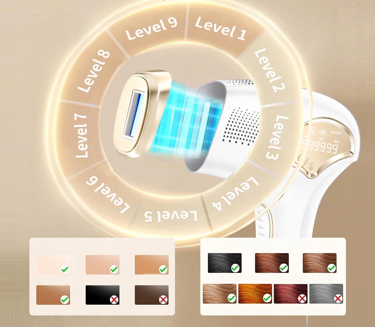 - Долговечное и безболезненное устройство для лазерной эпиляции имеет 9 уровней энергии, которые можно легко настроить в зависимости от цвета кожи и волос. > ul>