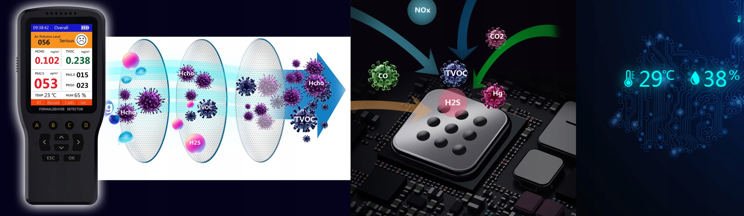 - Диапазон измерения концентрации летучих органических соединений TVOC: 0 ~ 9,999 мг/м3