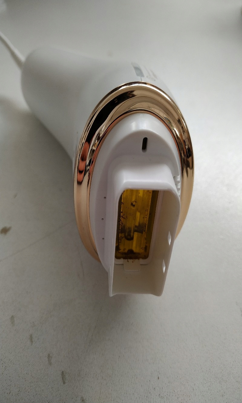 - Повреждён. Отсутствуют крышки и детали блока питания. Устройство не включается, кнопка настройки импульсной мощности зажата в корпусе. На лампе заметны значительные загрязнения.