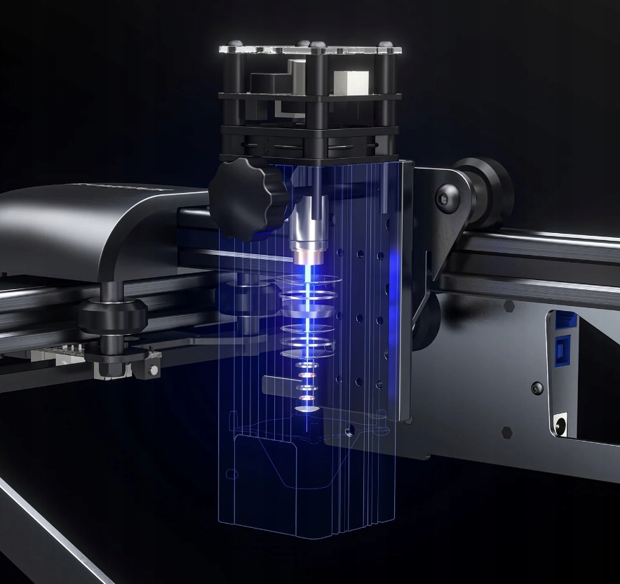 - Лазерная головка оснащена ручкой, благодаря которой мы можем легко регулировать ее высоту, а также стеклянным фильтром, поглощающим до 97% ультрафиолетового света, что позволяет вы сможете работать без необходимости носить защитные очки.