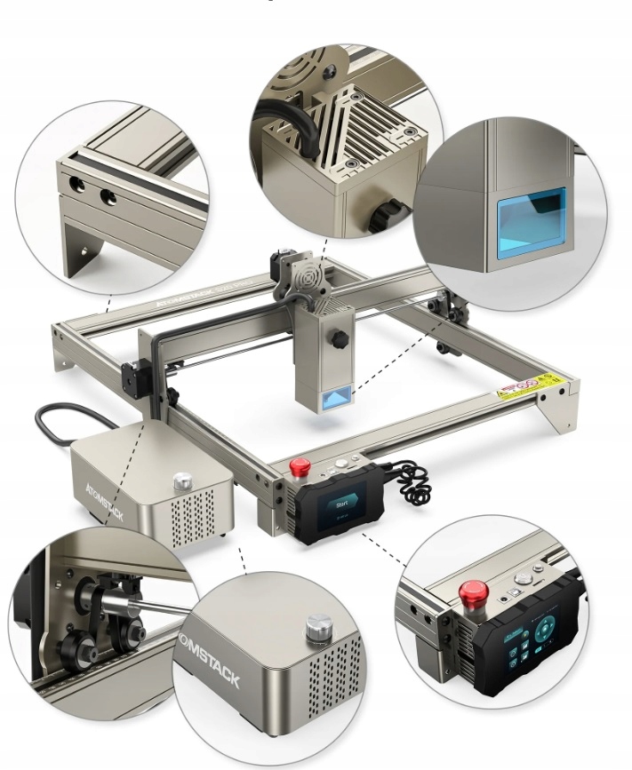 Лазерный гравер S20 Pro Atomstack имеет очень простой современный дизайн, благодаря которому вы сможете создавать различные проекты в потрясающем качестве — лазерная головка изготовлена с использованием новейших технологий, представленных на рынке: она состоит из из 4-х лазерных источников и нескольких линз фокусировки, что обеспечивает неслыханную в конкурирующих устройствах плотность лазера, гораздо большую фокусировку лазерного луча и реальную мощность лазера 20 Вт. Такая конструкция позволяет создавать гравюры с высоким разрешением и резать многие материалы.