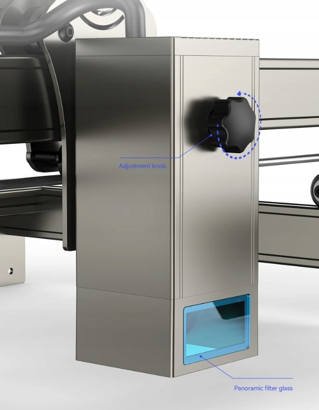 - Лазерная головка оснащена ручкой, позволяющей легко регулировать ее высоту, а также стеклянным фильтром, поглощающим до 97% ультрафиолета, что позволяет работать без необходимости носить защитные очки.