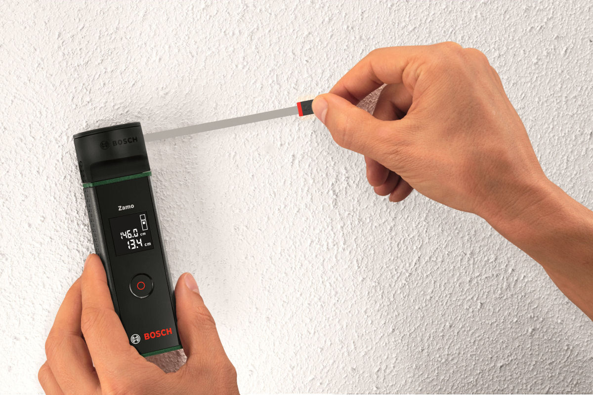 Лазерный дальномер BOSCH, модель Zamo предназначен для быстрых, простых и точных измерений с использованием лазерного луча. При нажатии кнопки он измеряет длину, а результат измерения отображается на большом жидкокристаллическом дисплее дальномера.