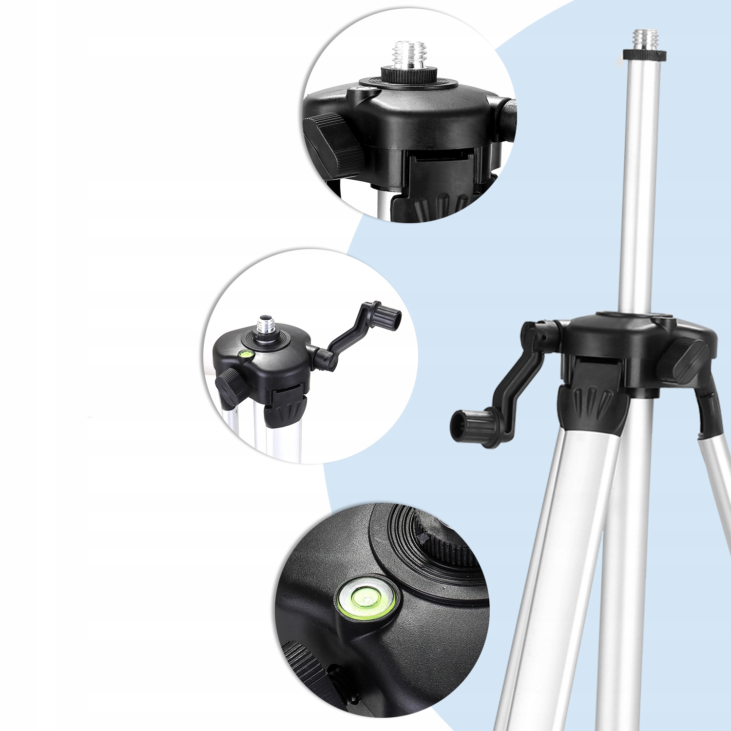 ✔ оснащен уровнем, который помогает проверить, является ли штатив горизонтальным или нет.
