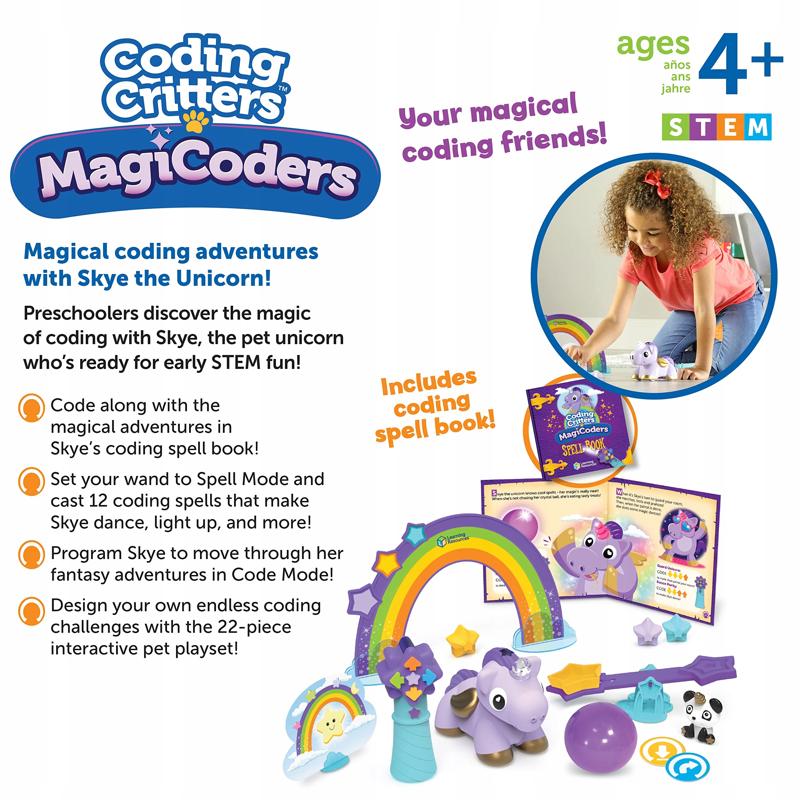 - входящие в комплект компоненты: 1 обучающие ресурсы Coding Critters MagiCoders Skye The Unicorn Early Stem Toy, набор из 22 предметов