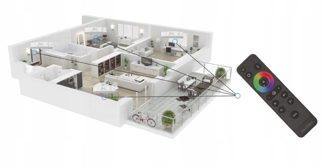 - Модель: VOLTA PROVERO 4-зонный пульт дистанционного управления DIM/CCT, обеспечивающий комплексное управление освещением.