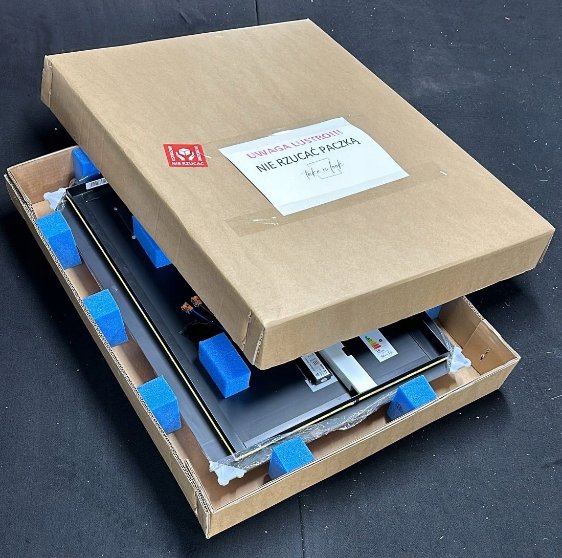 Наша продукция упакована очень тщательно. Окружающий пенопласт PAD защищает поверхность, а углы защищены пластиковыми колпачками. Все это защищено от царапин фольгой на поверхности и толстым картоном, помеченным с каждой стороны предупреждающими наклейками. На фотографиях ниже показано настоящее упакованное нами зеркало.