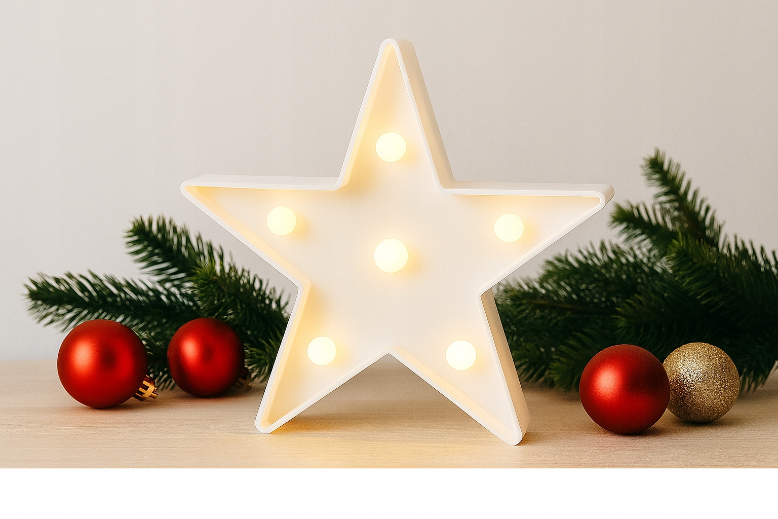 Ищете уникальное новогоднее украшение, которое привлечет внимание и создаст теплую атмосферу? Наша Светодиодная звезда высотой 15 см – идеальное решение! Изготовлен из прочного материала элегантного белого цвета, оснащен 6 светодиодными точками, излучающими нежный, теплый свет - идеально подходит для украшения гостиной, спальни, офиса или витрины магазина.