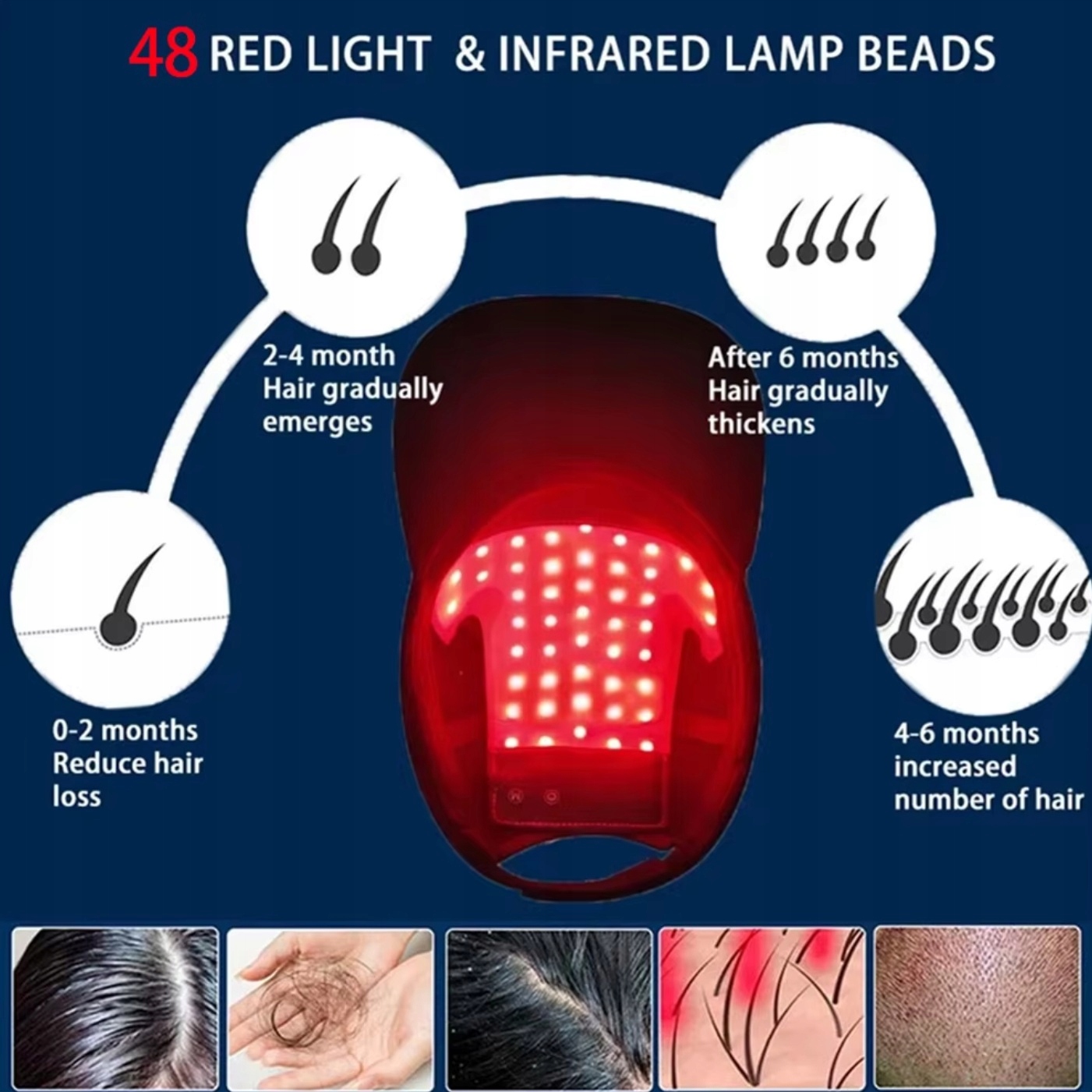 Три длины волн светодиодного света | Легкий и портативный | Выпуклый дизайн | Автоматическое измерение времени | 4 способа действия для роста волос | 48 светодиодов | Красный и синий свет 630 нм, 650 нм и 470 нм