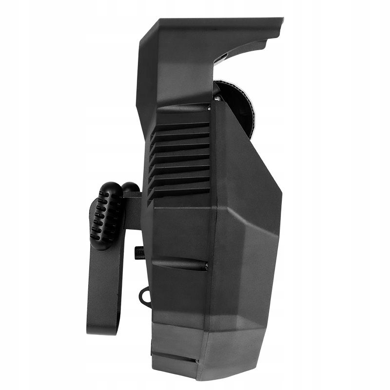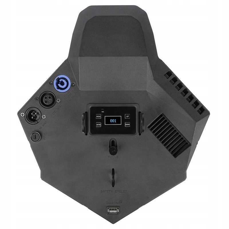 Сканер Light4Me Effect Venom FX имеет прочный пластиковый корпус с монтажным кронштейном, позволяющим устанавливать устройство на штативы, фермы и осветительные пандусы. В верхней части корпуса расположен разъем Powercon, вход и выход XLR, позволяющий управлять устройством по протоколу DMX, а также панель управления, состоящая из четкого дисплея и четырех кнопок. С их помощью мы можем перемещаться по меню, вносить изменения во внутренние настройки сканера и выбирать один из нескольких режимов работы аппарата: