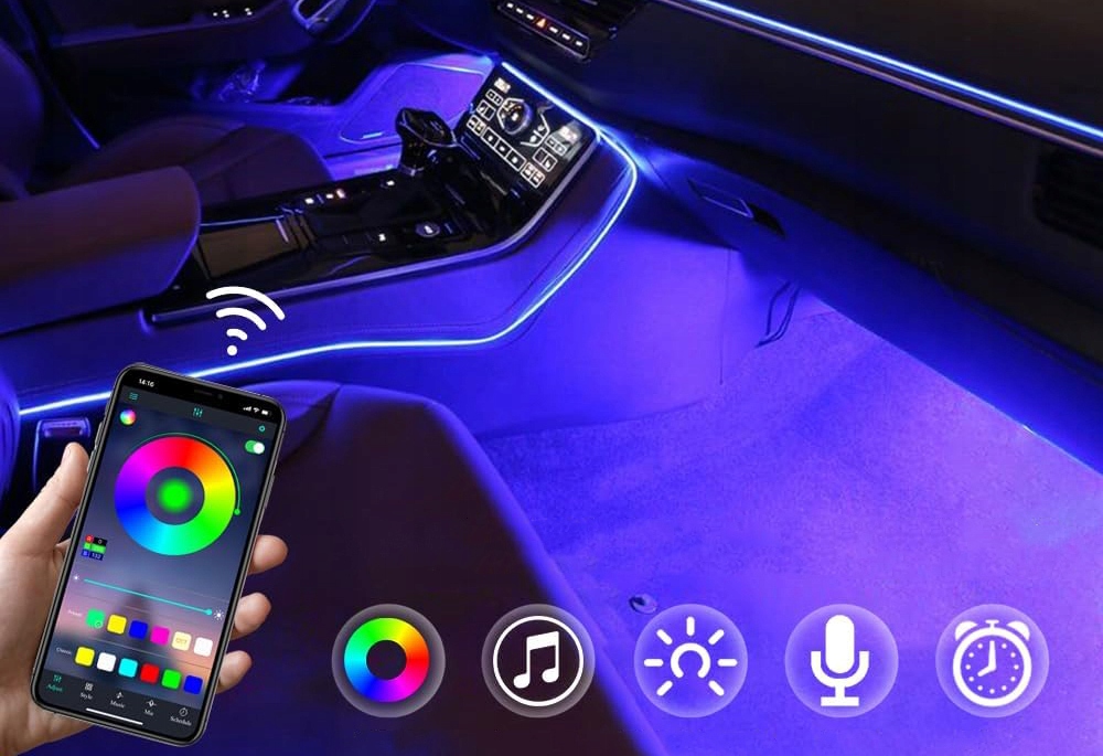 Благодаря встроенному микрофону оптоволокно становится частью вашего окружения. Реагирует на звуки, которые его окружают, а это значит, что если вы находитесь на вечеринке или в месте, полном музыки, оптоволокно создаст динамическое освещение, соответствующее атмосфере. Это означает, что ваш автомобиль может стать частью веселья и азарта, где бы вы ни находились.